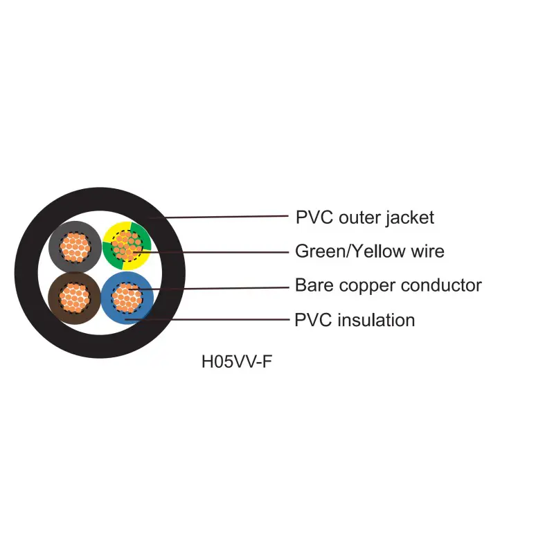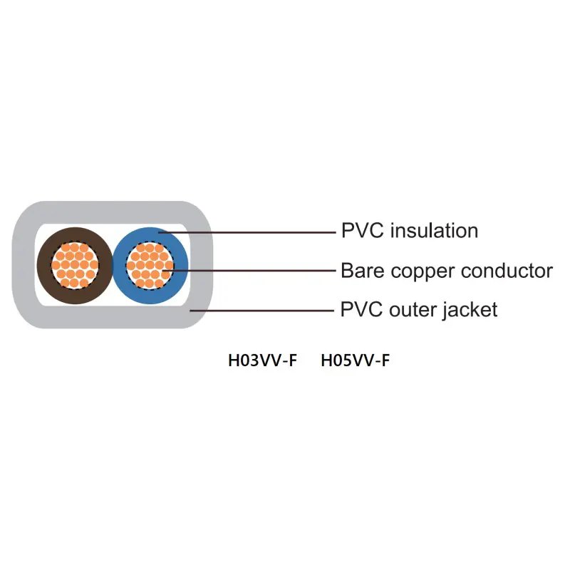 Tá H05VV-F, H05VVH2-F, H03VV-F, H03VVH2-F comhdhéanta de sheoltóirí copair fíneáil Aicme 5, insliú PVC saor ó luaidhe agus sheath.